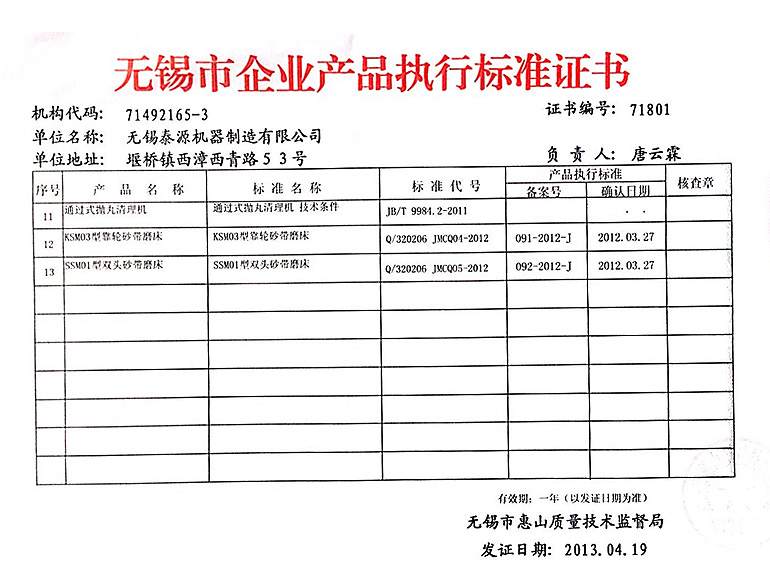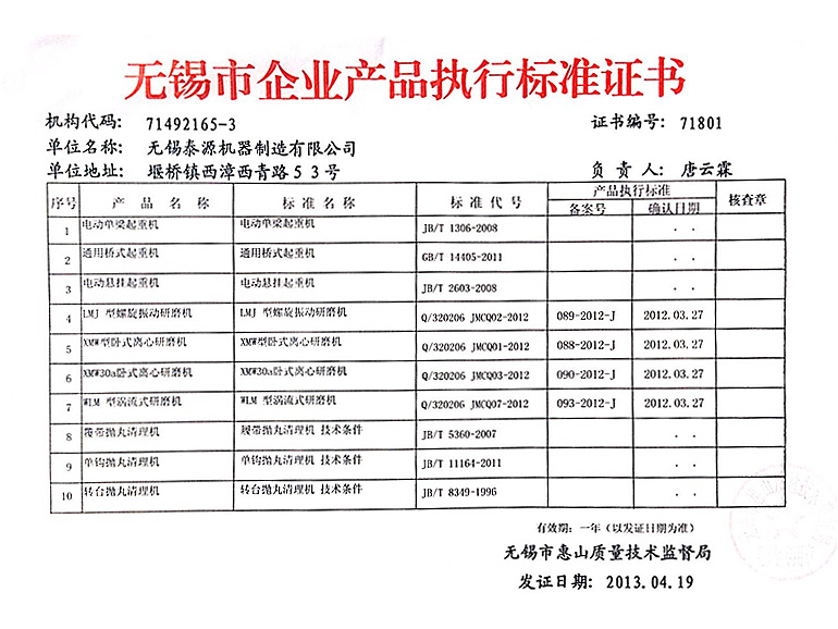 无锡市企业产品执行标准证书