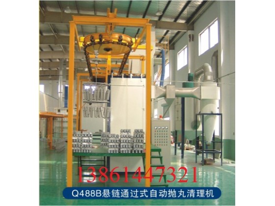 1、 本机采用无地坑结构,安装方便,减少投资费用。 2、 结构紧凑,效率高,清理质量好,工作安全可靠,运转平稳。 3、 清理室采用高铬锰板,耐磨耐冲击,强度好。 4、 双吊钩结构,彼此独立工作,互不影响,提高生产效率,吊具采用行星原理,自转公转同时进行,处理后的工件不存在阴阳面。 5、 二级除尘(旋风除尘,布筒过滤器),吸风量大,灰尘过滤干净,空气排放符合环保标准。 6、 装配严谨,优质轴承、电机运转噪音底。抛丸清理跟其它清理技术相比具有下述优点:提高机械产品和金属构件的抗疲劳性能,消除应力集中,延长其使用寿命,优化工件的表面工艺状态,大大提高清理效率,减轻清理工作的劳动强度,减轻环境污染。